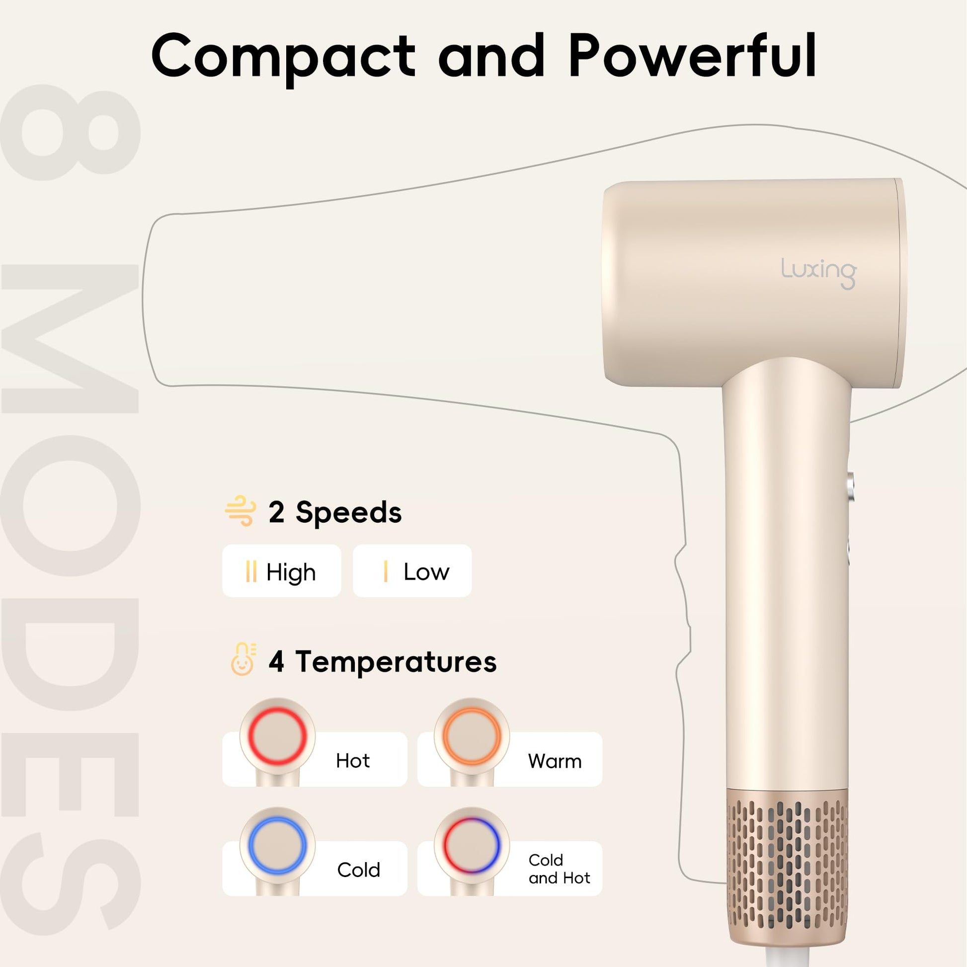 - [Customizable Settings with Smart Temperature Control] Luxing TurboLux hair dryer features a 3-color LED indicator with 4 temperature modes (Hot, Warm, Cool, and Alternating) for all hair types, from fine and delicate to thick and textured. Two speed options (Turbo, Gentle) offer flexible, yet stable styling control. Luxing NTC intelligent control chip monitors and adjusts airflow up to 500 times per second to maintain consistent heat, prevent damage, and deliver smooth, healthy-looking results