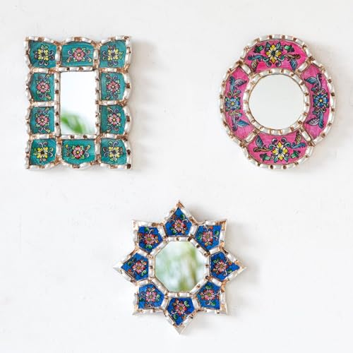 Handmade Mirrors set of 3 for Wall Decor - Silver Leaf Small Mirror Set - Turquoise, Blue, Fuchsia Accent Decor (6in)