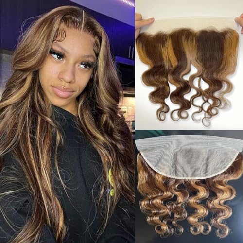Honey Blonde Highlight Body Wave 13x4 Frontal Human Hair 20 In, 100% 12A Brazilian Virgin Ombre Brown Transparent Lace Frontal Closure Pre Plucked with Baby Hair P4/27 Balayage Wavy Hair Remy
