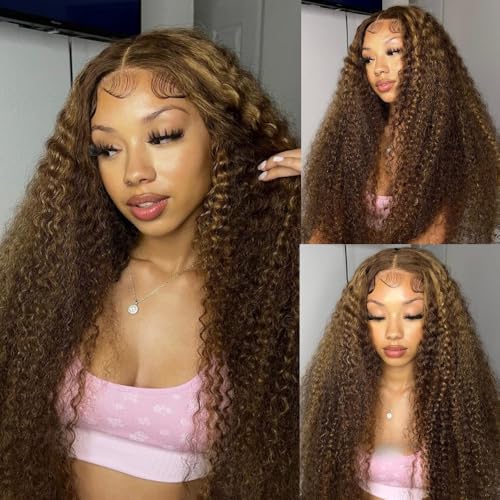 Honey Blonde Ombre Lace Front Wig Human Hair 13x5 Highlight Deep Wave Curly Wig 4/27 Colored HD Transparent Lace Front Wigs Human Hair Pre Plucked with Baby Hairs 180% Density 22 Inch