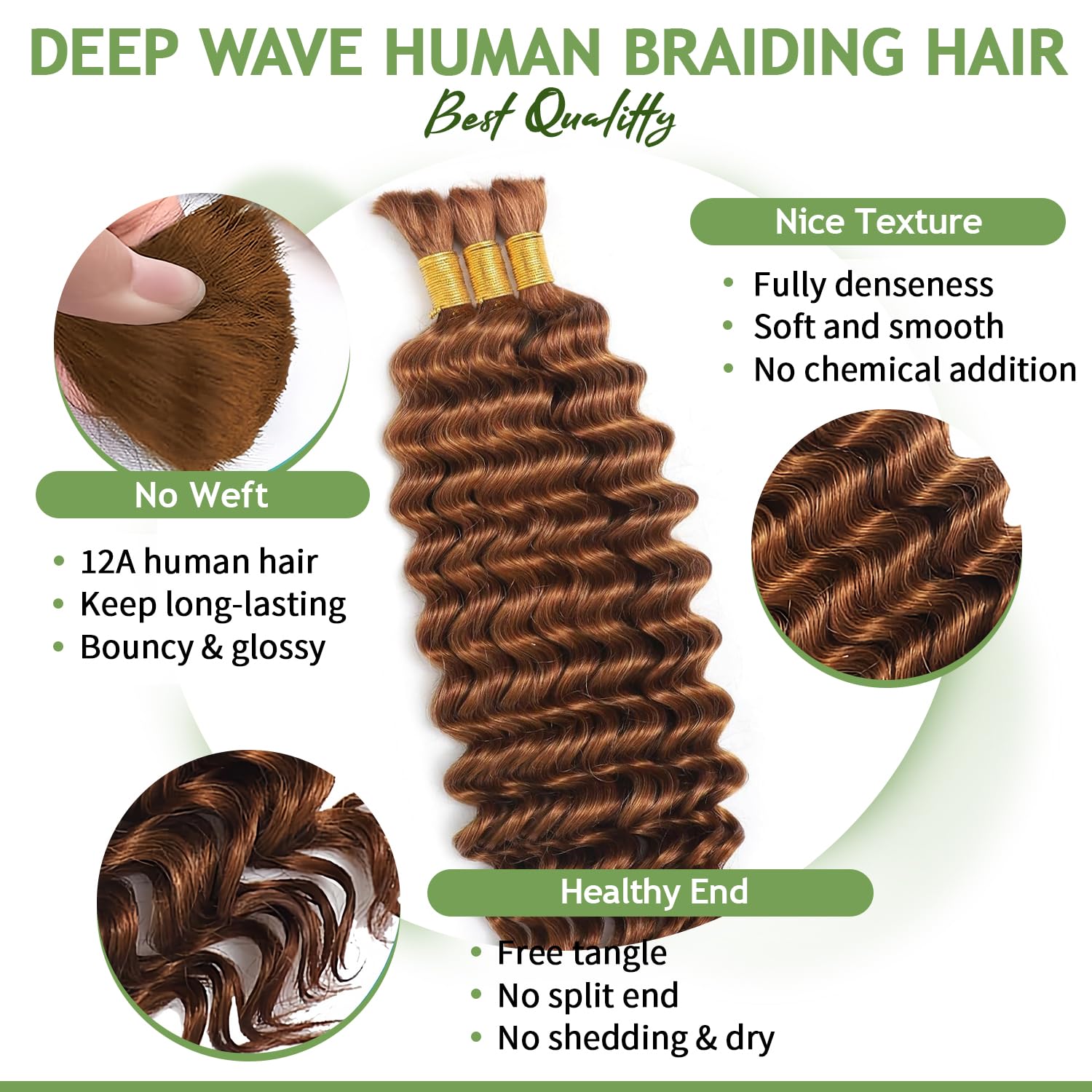 Human Braiding Hair for Boho Braids 120g 12A Deep Water Wave Bulk Human Hair Knotless Boho Braiding Curly 100% Virgin No Weft Extensions Bohemian Braids 3 Bundles/Pack Auburn Ginger 24 Inch