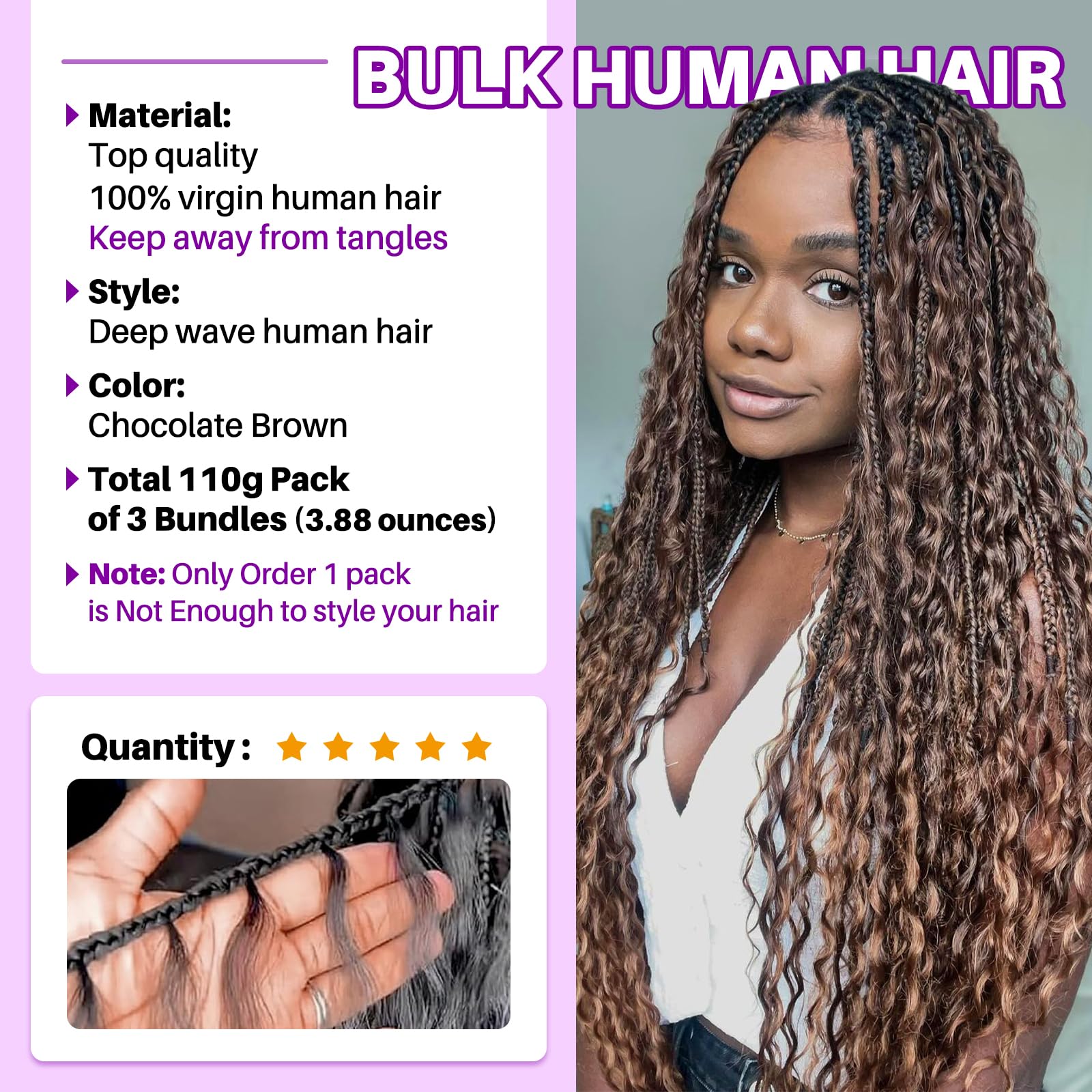 - Elevate Your Style: Crafted with 100% unprocessed Brazilian remy virgin human hair braiding hair, our deep wave bulk human hair for braiding offer a luxurious texture that's smooth, soft, and bouncy. Experience tangle-free, durable strands that resist shedding and are easy to manage. From boho knotless braids to goddess box braids, ensuring your braids stay flawless for every occasion.