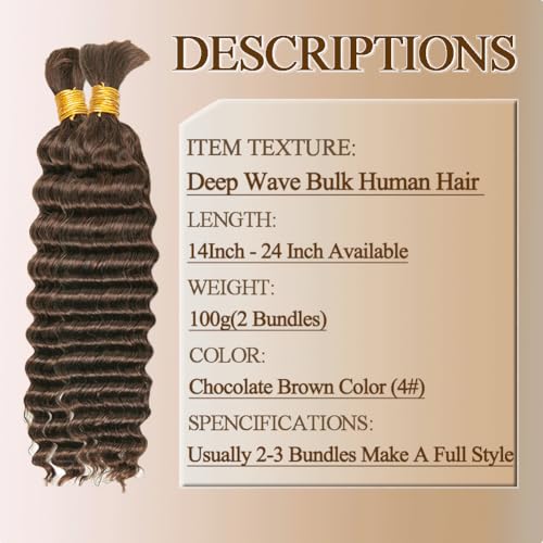 Human Braiding Hair For Braids 24 Inch 100g/2Bundles Deep Wave Bulk Human Hair For Braiding Wet And Wavy Human Hair Extensions For Braids 12A No Weft Deep Wave Bulk Human Hair Chocolate Brown