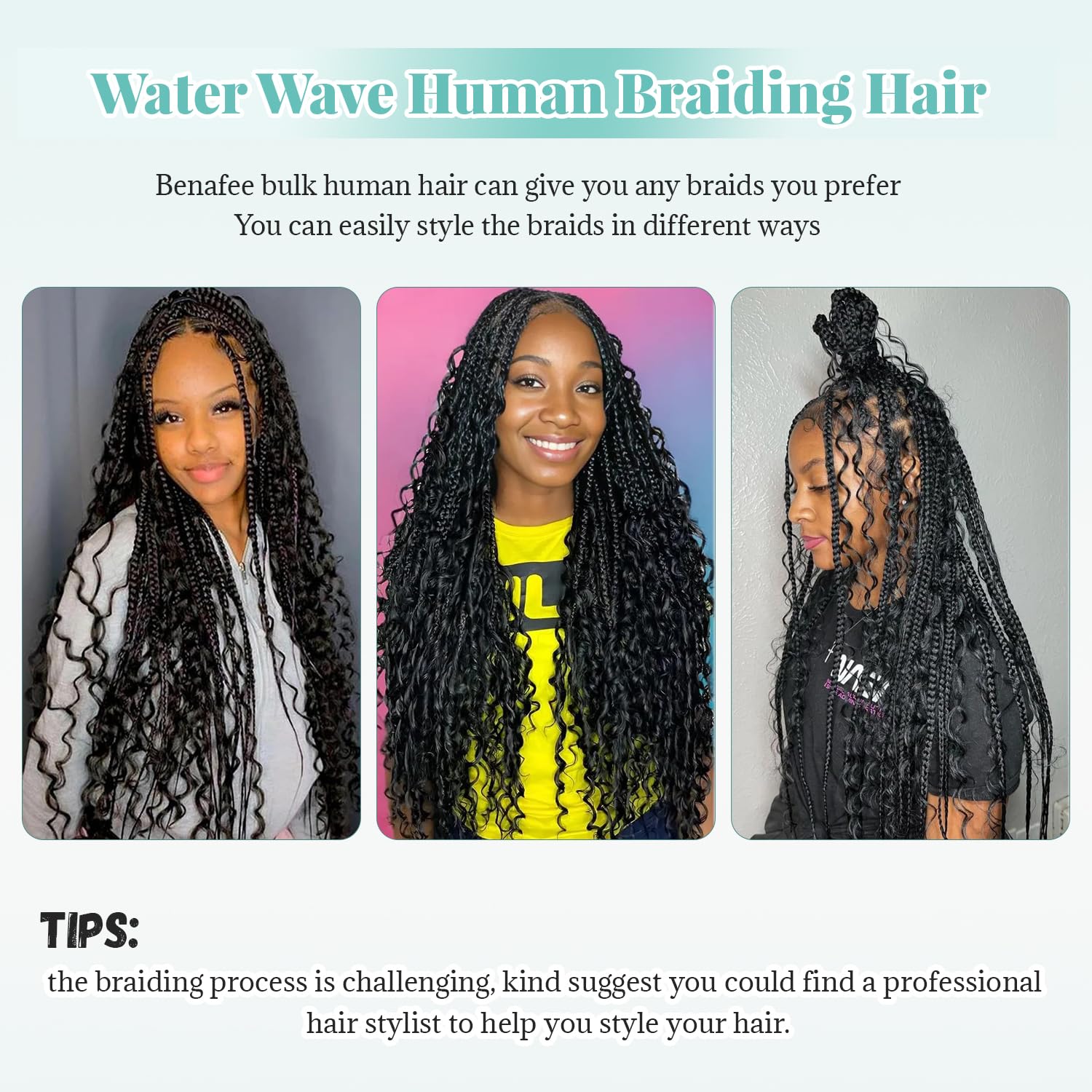 - 【Stunning in Any Occasion】Water wave bulk human hair is very suitable for various weaving styles, such as bohemian braids, knotless braids, box braids, cornrows, and twists, add hair length and volume to your natural hair. Benafee water wave human boho braiding hair can help you unleash your glamour and make you become the centre of attention. A perfect choice for fashion-forward women to elevate their style.
