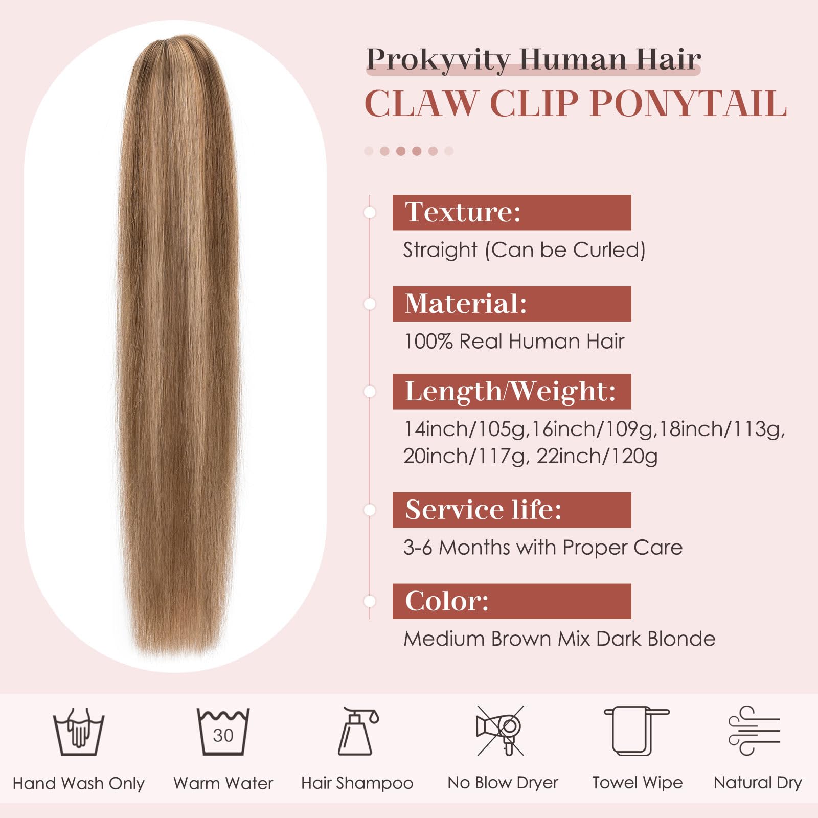 - 【Effortless Application with Secure Hold】Our claw clip is designed for easy application and removal, making your hairstyling effortless.Featuring high elasticity and a firm grip, this claw clip ponytail extension human hair is comfortable for all-day wear. In just seconds, you can transform your look, whether it's for a casual outing or a special event, ensuring that you look your best without the hassle. Don’t wait; choose Prokyvity to upgrade your hair game today.