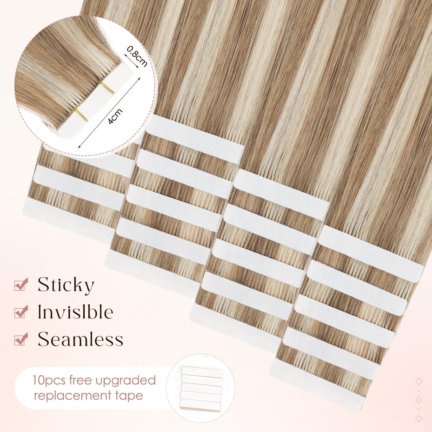 Human Hair Tape in Extensions-Double Stitched,SLEEKALON Free-cut Mini Tape ins Real Hair Extension Highlights Bleach Blonde mix Brown Seamless Straight Double Side Tape Hair-16 Inch,20pcs 50g,#12P613