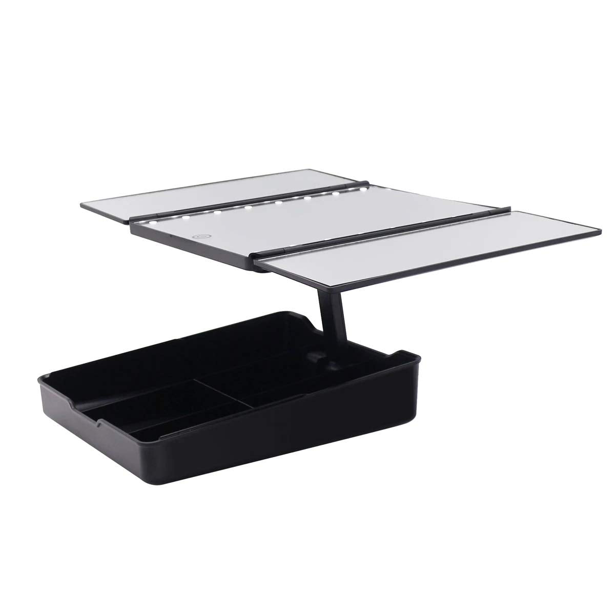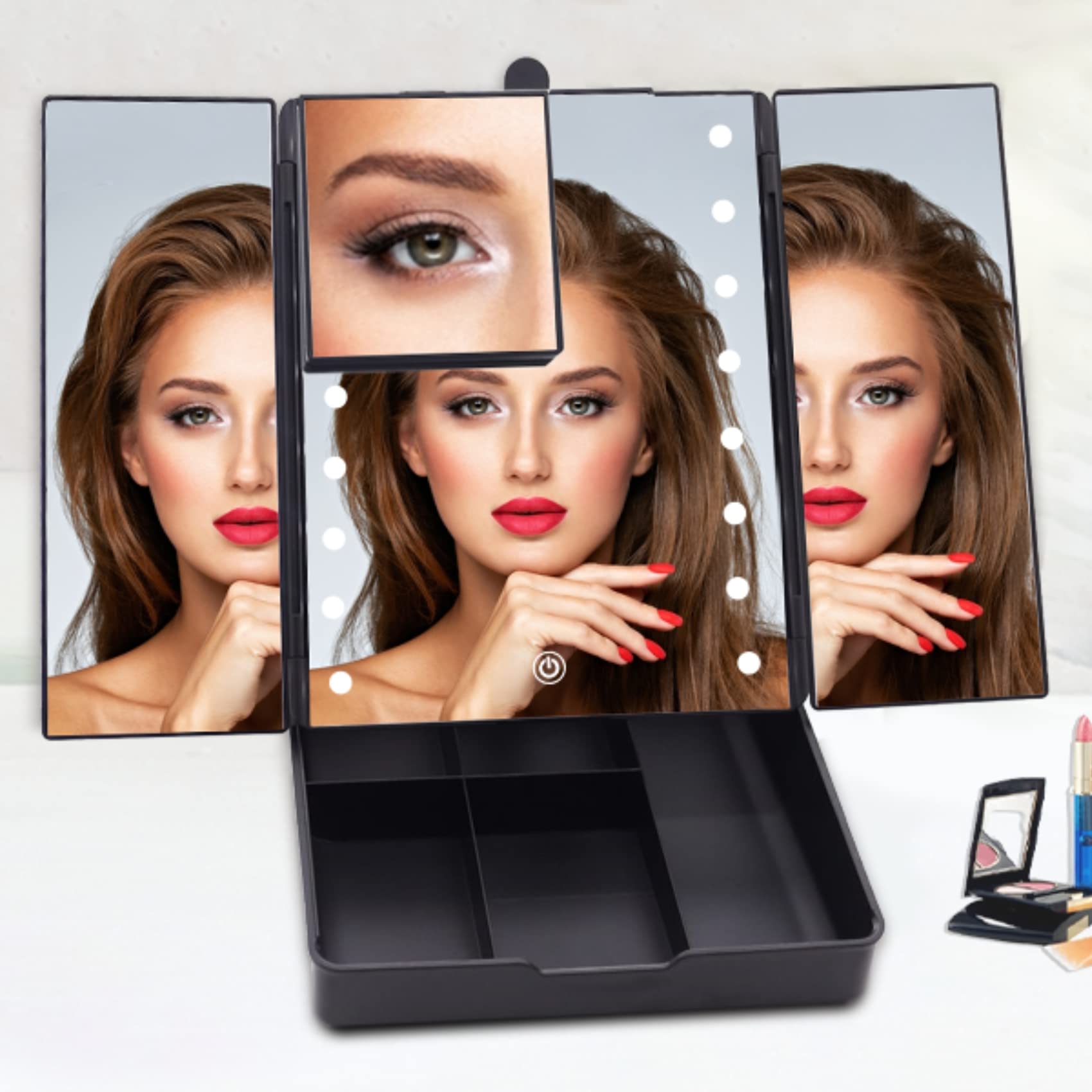 - 𝐓𝐑𝐈𝐅𝐎𝐋𝐃 𝐌𝐈𝐑𝐑𝐎𝐑: This vanity trifold mirror has 3 adjustable panels including 7x magnified mirrors with storage slot to enhance the level of your makeup and provide wide angle details