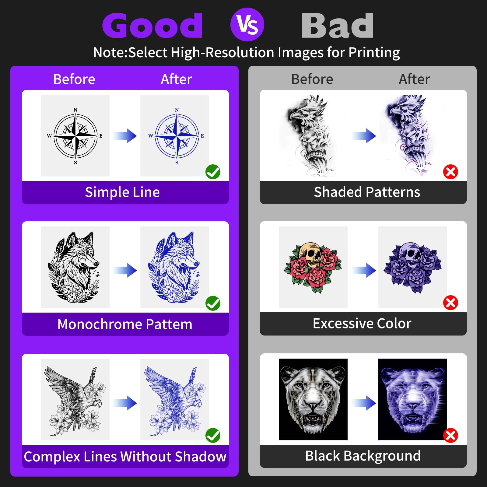 - Easy Operation: Designed for user convenience, the JADENS tattoo printer kit simplifies the design-to-stencil process. Just follow straightforward steps: remove the yellow paper, take off the protective film, open the printer, insert the paper, and print using the intuitive "Printat" app. Ideal for both beginners and professionals