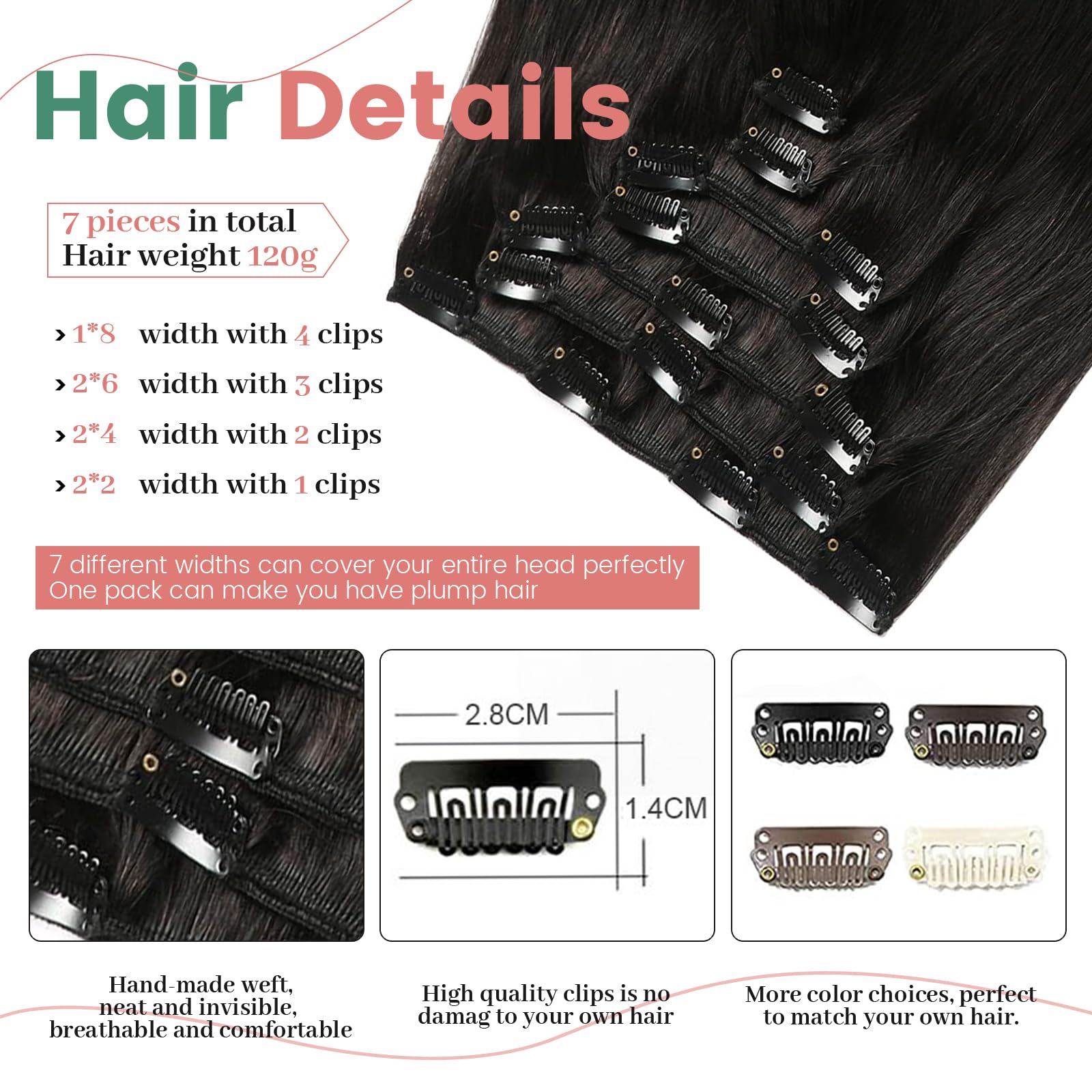 - 【Product Specification】Jessbo Offers Clip-In Human Hair Extensions, Consisting Of 7 Pieces With 120g Weight And 16 Clips Per Set. The Net Weight Is 105g Without Clips And 120g With Clips. For Those Looking To Thicken Their Hair, We Suggest Using 1-2 Sets; For A Full Head, 2-3 Sets Are Recommended; And For Adding Both Length And Volume, We Recommend Using 2-3 Sets.