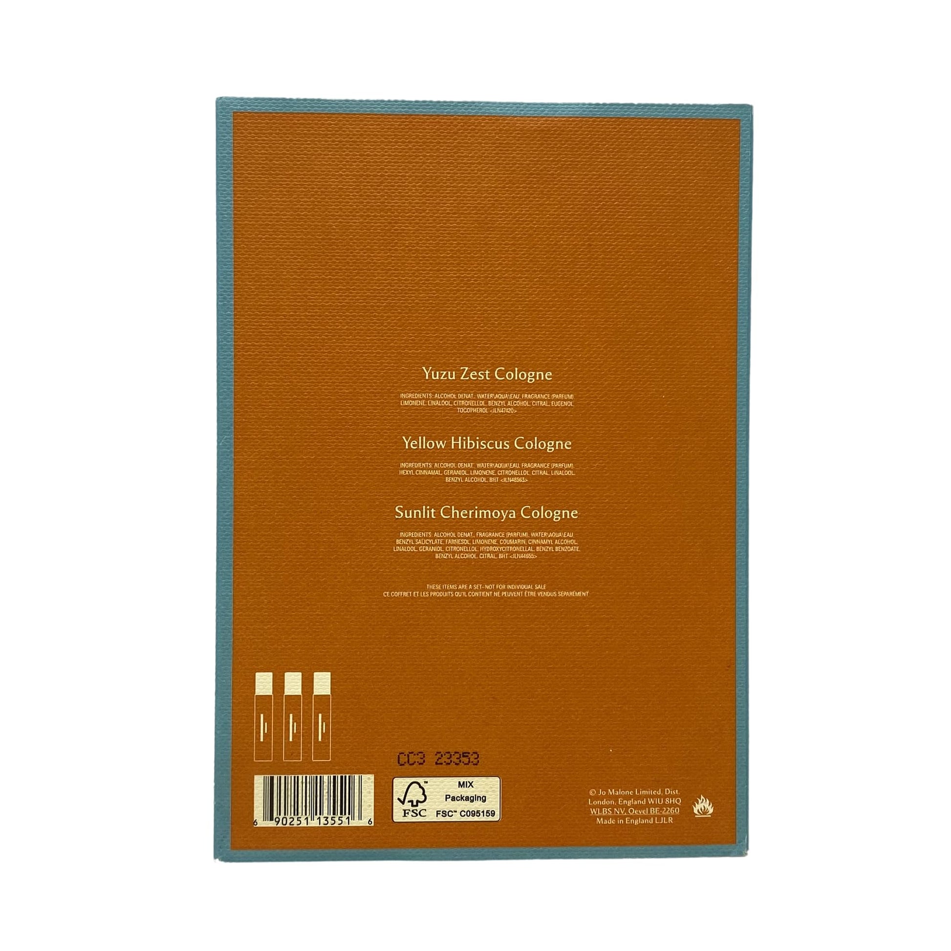 - INCLUDES: 0.34 fl oz / 10 mL travel Yuzu Zest Cologne, 0.34 fl oz / 10 mL travel Yellow Hibiscus Cologne, and 0.34 fl oz / 10 mL travel Sunlit Cherimoya Cologne.