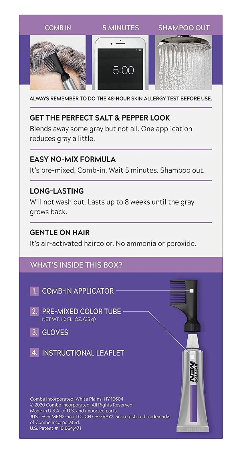 Details: Just For Men Touch Of Gray T-45 Dark Brown Easy Comb-In Haircolor. Partial gray coverage.5 easy minutes.Subtle results:Reduces the amount of gray with each application.And even with repeated applications it will never get rid of all the gray.To get more gray coverage, you can do a 2nd or 3rd application.