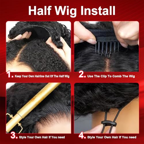 - ??Half Wig Features??New upgrade flip over human hair half wigs are without any lace and glue.The wigs can show your own hairline.You can still install the wig like lace Wig.And our new upgrade flip over human hair half wigs are more comfortable.You can use less time to wear and remove.The adjustable drawstring can help you adjust shape and size more conveniently.Extend four combs can fix more hair.Our kinky-curly half wigs are so easy to install.Perfect human hair wig for new beginners.