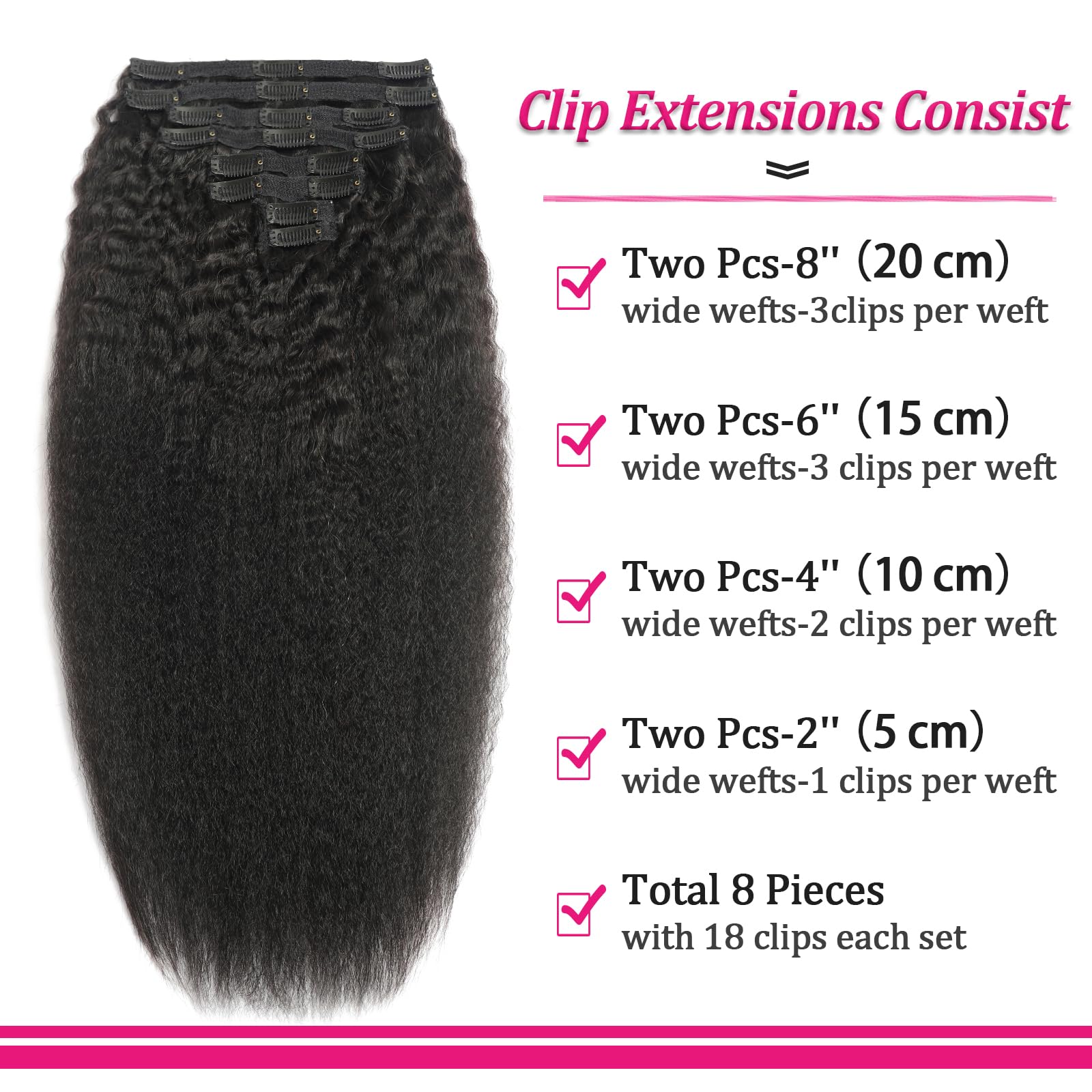 - Clip in Hair Extensions Specification: Kinky straight clip in hair extensions, 8Pcs with 18 clips per set. Various lengths are available. If you want to add volume to your hair, we recommend 2 sets. If you want a full head of hair, we recommend 3 or more sets.