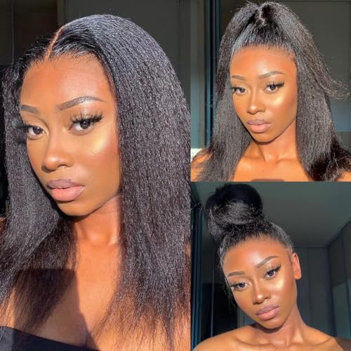 Kinky Straight Wig Human Hair 14 inch Glueless Kinky Straight 13x4 Lace Front Wig Pre Plucked HairLine with Baby Hair 180% Density Yaki Straight Wigs Natural Black Color