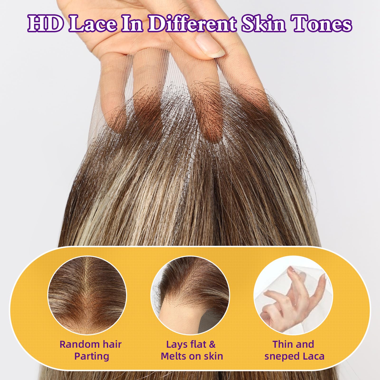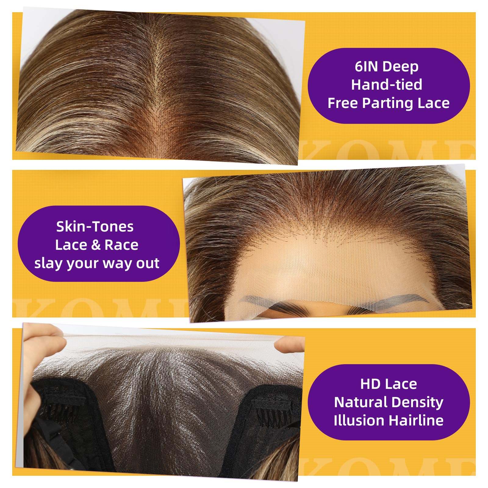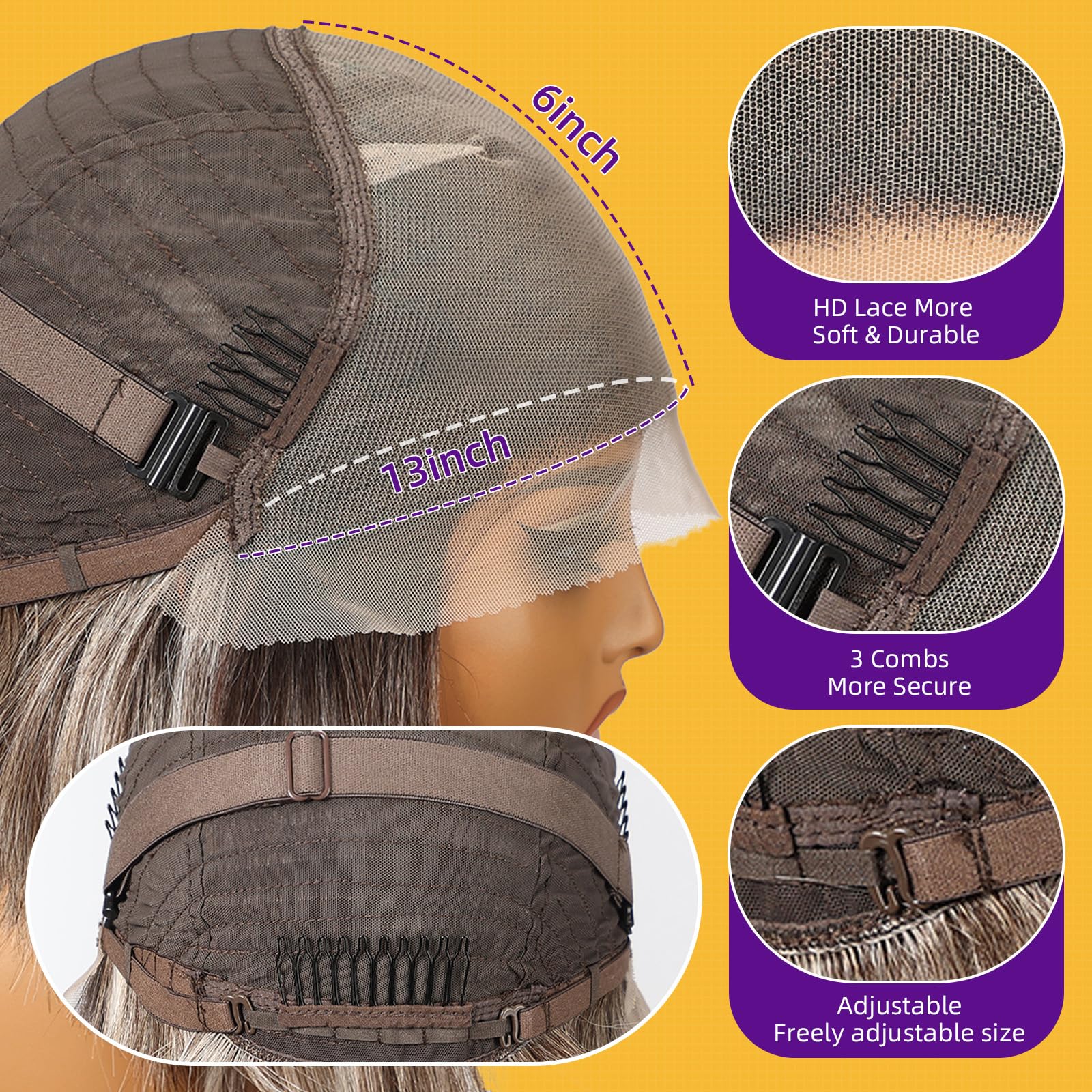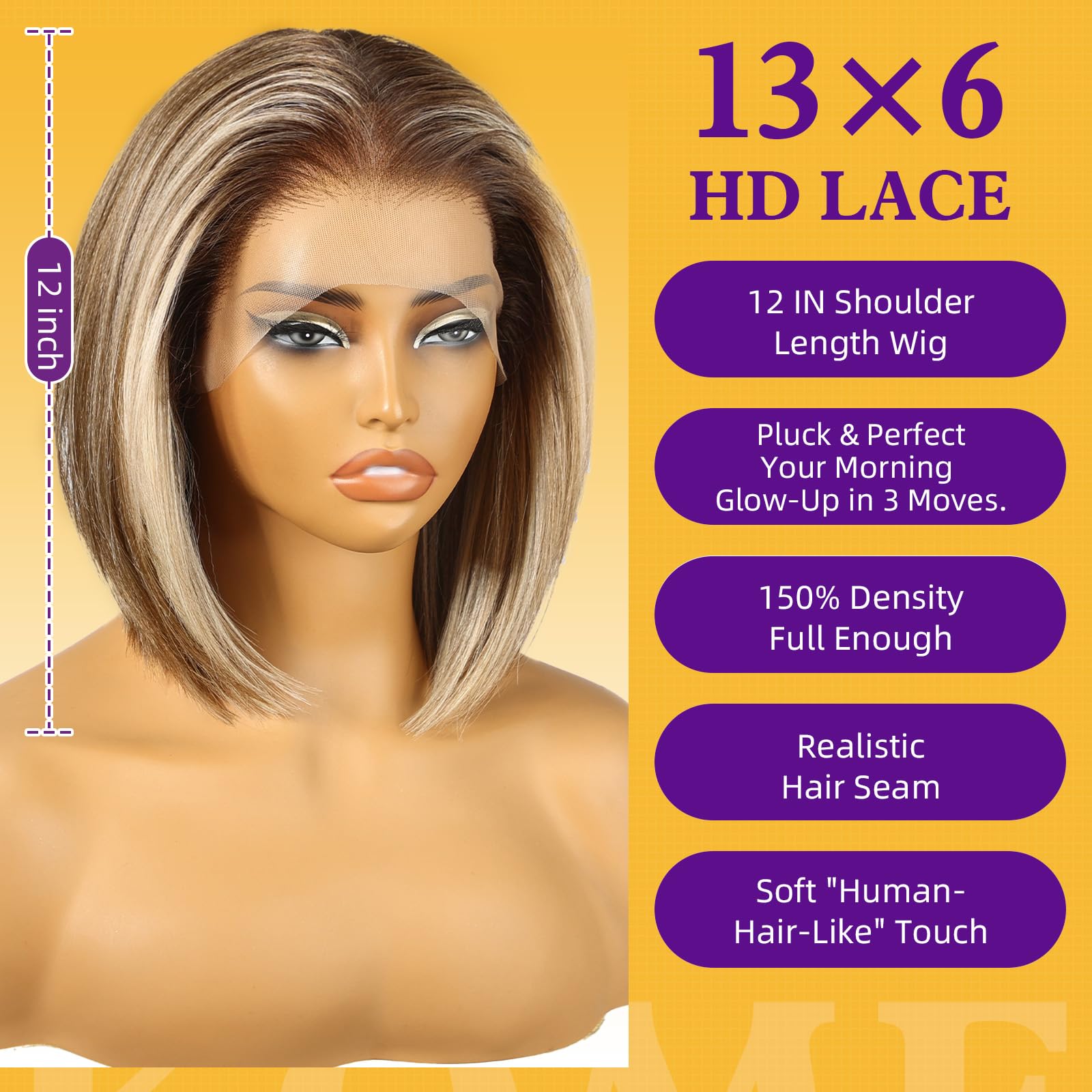 KOME Ash Blonde Highlight Synthetic Lace Front Wig,13×6 HD Short Straight Glueless Bob Wig for White Women Daily Use 12IN(#TT6/166)