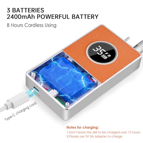 - PORTABLE NAIL DRILL WITH LARGE BATTERY CAPACITY - With 24000mAh large capacity battery, the rechargeabledrill para u?as profesional can be cordless used up to 8 hours! The compact size is portable for travel without frequent charges. Comes with USB Type C charging, you can charge it with adapter, charging bank, laptop etc..