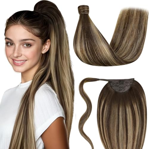 LaaVoo Ponytail Extension Human Hair 20 Inch Ponytail Hair Extensions Caramel Blonde Balayage Brown 80g