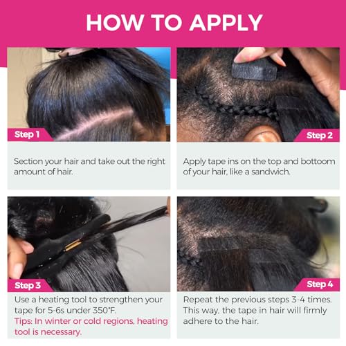 - [Durable Upgraded Tape & Suggested Application] Double-sided, secure, invisible, and long-lasting upgraded tape. The tape is durable and easy to apply or remove without hurting your own hair. You can remove it as needed. Specifications of Tape in Hair Extensions: 1.5 inches in width, 40 pieces, 100 grams per package. If you desire thicker hair, we suggest 2 to 3 packs for a thick and full head. With proper maintenance, our tape in hair extensions can be utilized for 3 to 4 months.