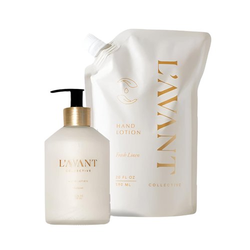 L'AVANT Collective Luxury Hand Lotion & Refill Bundle Fresh Linen | High Performing with Aloe Leaf Juice Notes of Bamboo, Ylang Ylang, Jasmine, Geranium, Sage Reusable Glass Bottle Home Decor Gifts