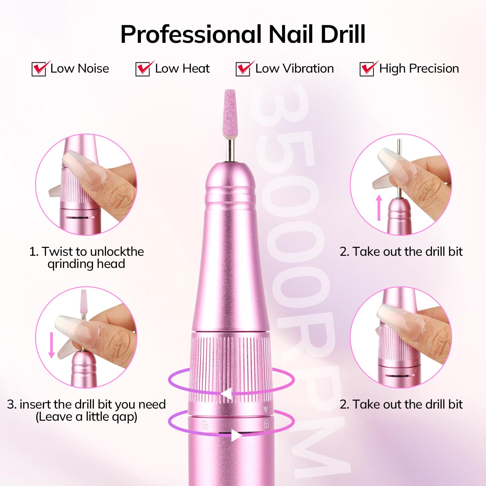 - Ergonomic Handpiece: Crafted from high-quality aluminum alloy, the handpiece of this electric nail drill is designed for comfort and efficiency. The ample ventilation holes effectively dissipate heat, while the pencil-shape and lightweight design minimize hand fatigue, even during extended use. Compatible with all 3/32” shank bits, it offers precision and control.
