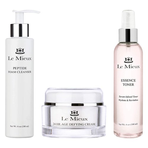 - This bundle includes Le Mieux’s luxurious Peptide Foam Cleanser, Essence Toner and 24 Hr Age-Defying Cream for facial hydration.