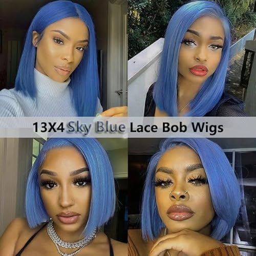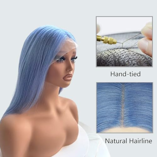 Light Blue Wigs 100% Brazilian Virgin Human Hair,Shiny and Bouncy 10A Grade Bob Wigs,13x4 HD Transparent Straight Lace Front Human Hair Wig 180% Density,Small Knots Easy to Bleach(16Inch,Light Blue)