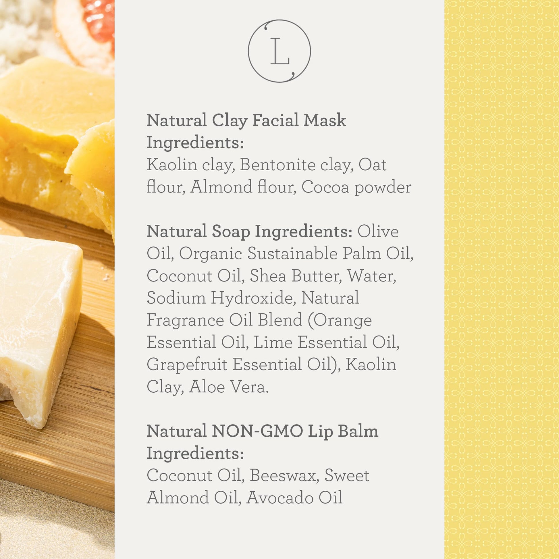 - SPA DAY KIT FOR WOMEN: Relax with this citrus bath set and gift box for women, which includes a citrus soap bar, a grapefruit soap bar, body scrub, shower mist, a clay mask, lip balm, a “Make a Wish” soy candle, a soap saver pouch, and a makeup bag.
