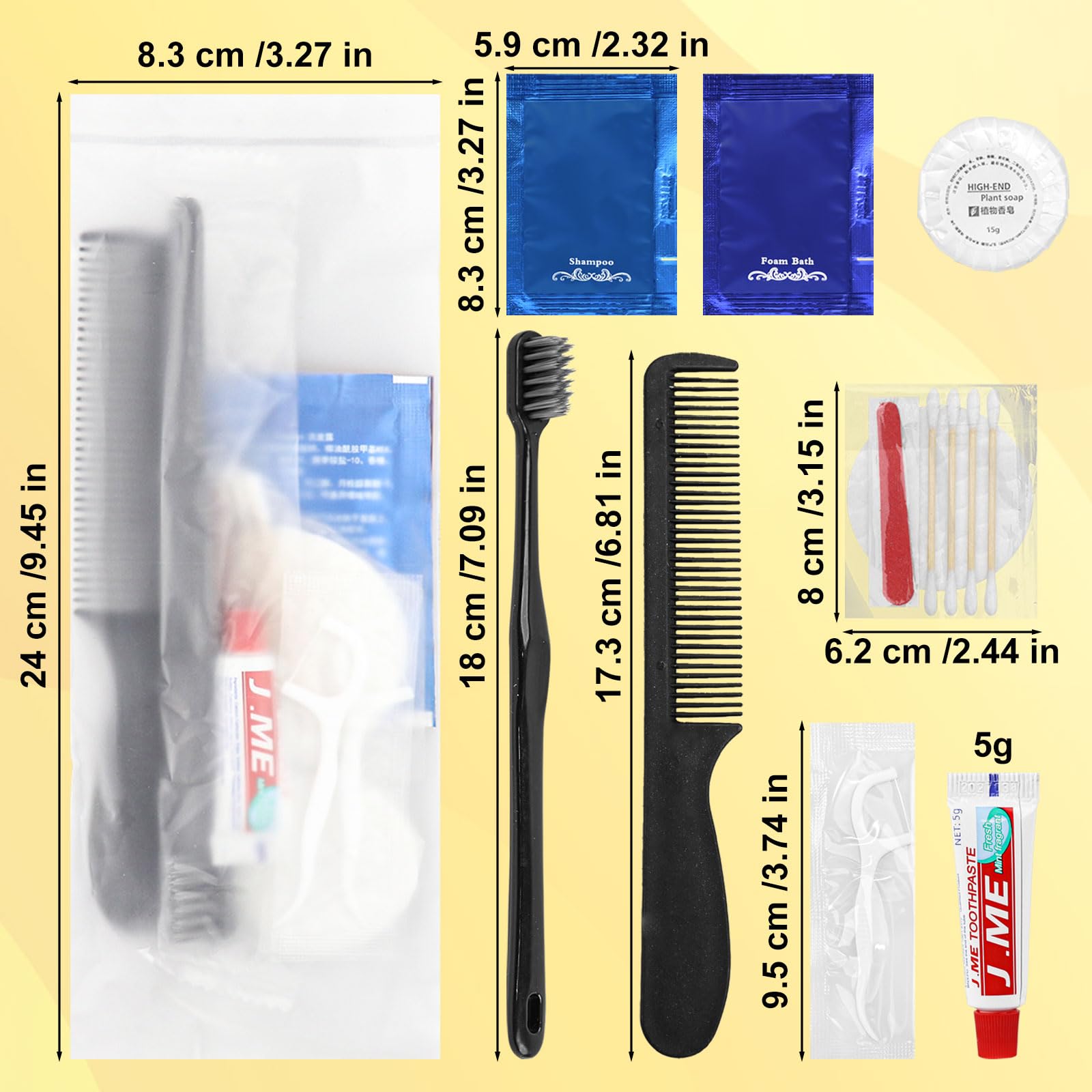 - More sets to match: our hygiene travel kit comes in a pack of 100 sets(Box Size: 15.4 X 11.8 X 5.5 Inch). Each travel size hygiene products bulk set consists of a toothbrush, toothpaste, comb, bath gel, shampoo, soap, nursing bag set (including cotton, cotton swab and nail file), and 2 lndividually packed floss picks. personal care travel size toiletries make it even more comprehensive, convenient and comfortable to use.