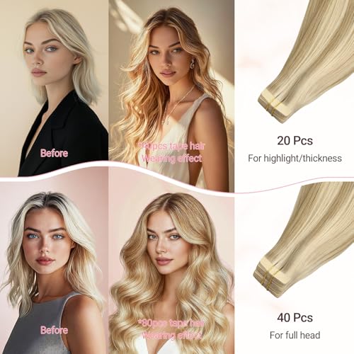 MAXITA Tape in Hair Extensions Human Hair, Balayage Light Blonde Highlighted Golden Blonde Grey Tone 24Inch 50g 20pcs, Thick Ends Straight Seamless Tape ins, Invisible Hair Extensions Real Human Hair