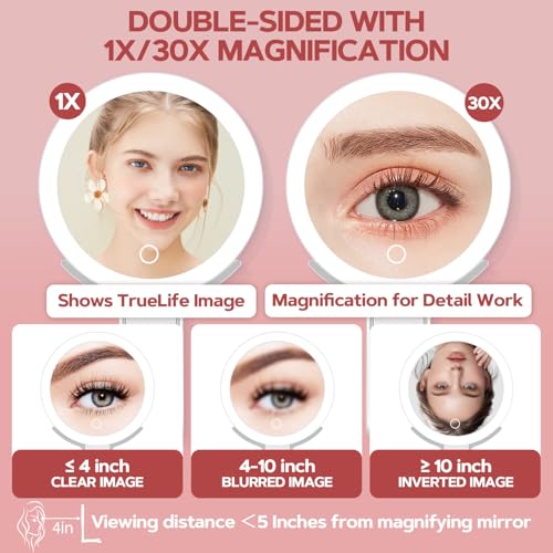 - 30X Magnifying Mirror with Light: This 30X magnifying mirror is a double-sided with both a 1X flat mirror for everyday use and a 30X mirror for fine make-up applications such as installing eyelashes, plucking nose hairs and eyelashes