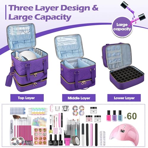 Nail Polish Organizer Case - Three Layer Nail Polish Storage Bag with Adjustable Dividers Holds 84 Bottles Nail Polish Nail Lamp Nail Kit Supplies Organizer Box - Purple