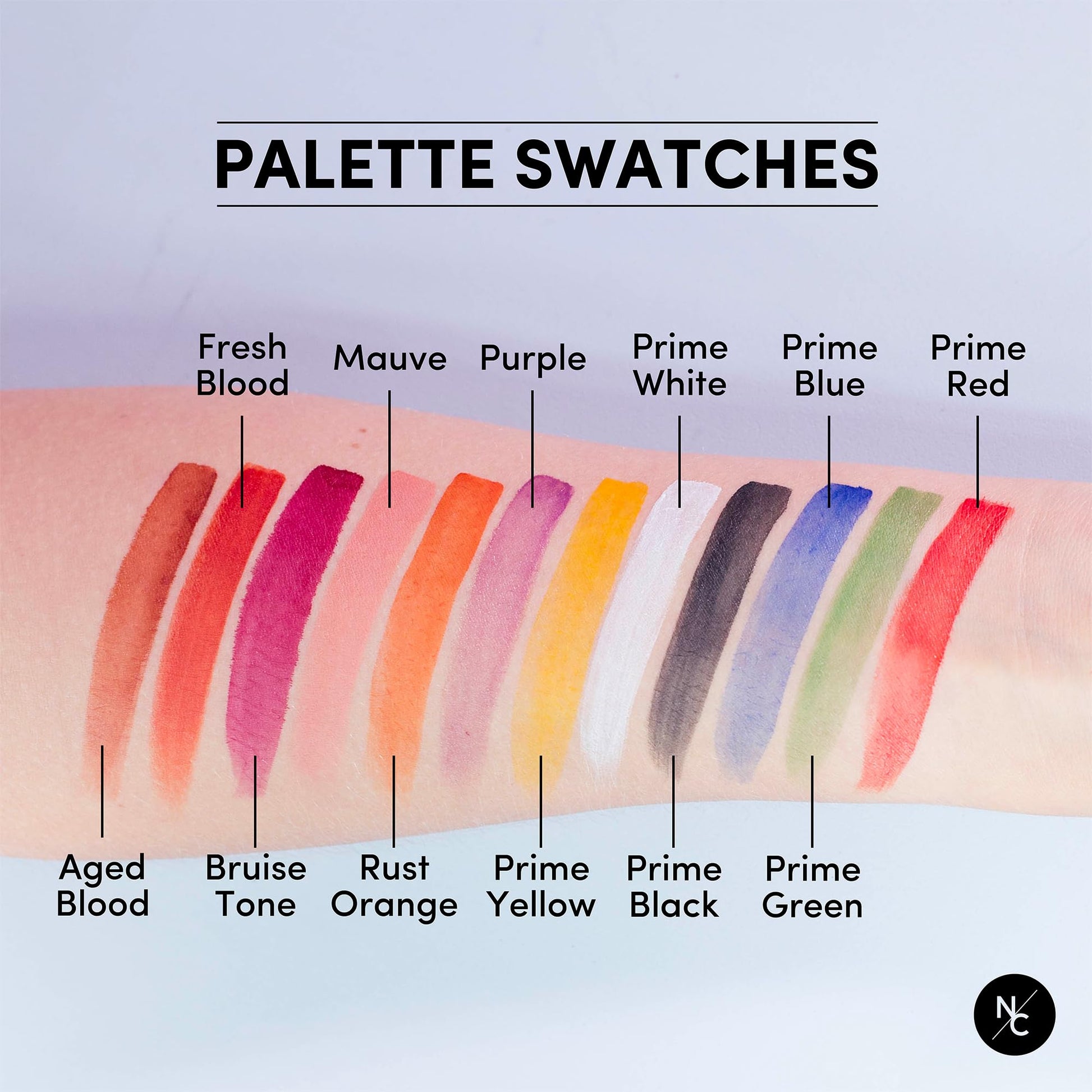 - 12 COLORS: Prime Red, Prime Green, Prime Blue, Prime Black, Prime White, Prime Yellow, Purple, Rust Orange, Mauve, Bruise Tone, Fresh Blood, Aged Blood.