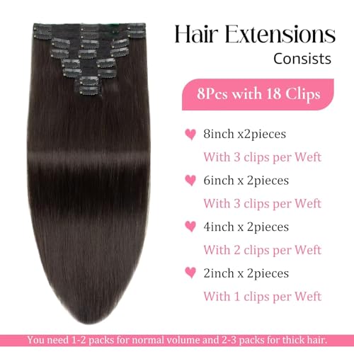 - ¡¼Natural Black Real Hair Extensions Clip in Human Hair Specification¡½: Each set of clip in human hair extensions include 8 pieces with 18 clips,and 2 extra clips. The length and weight for straight clip ins human hair extensions:14inch-90g, 16inch-100g,18inch-100g,20inch-105g,22inch-110g,24inch-120g.Different weight and length options cater to individual preferences, offering users the choice between adding length or volume based on their unique needs. If you have thin hair, we recommend to purchase one more packs.