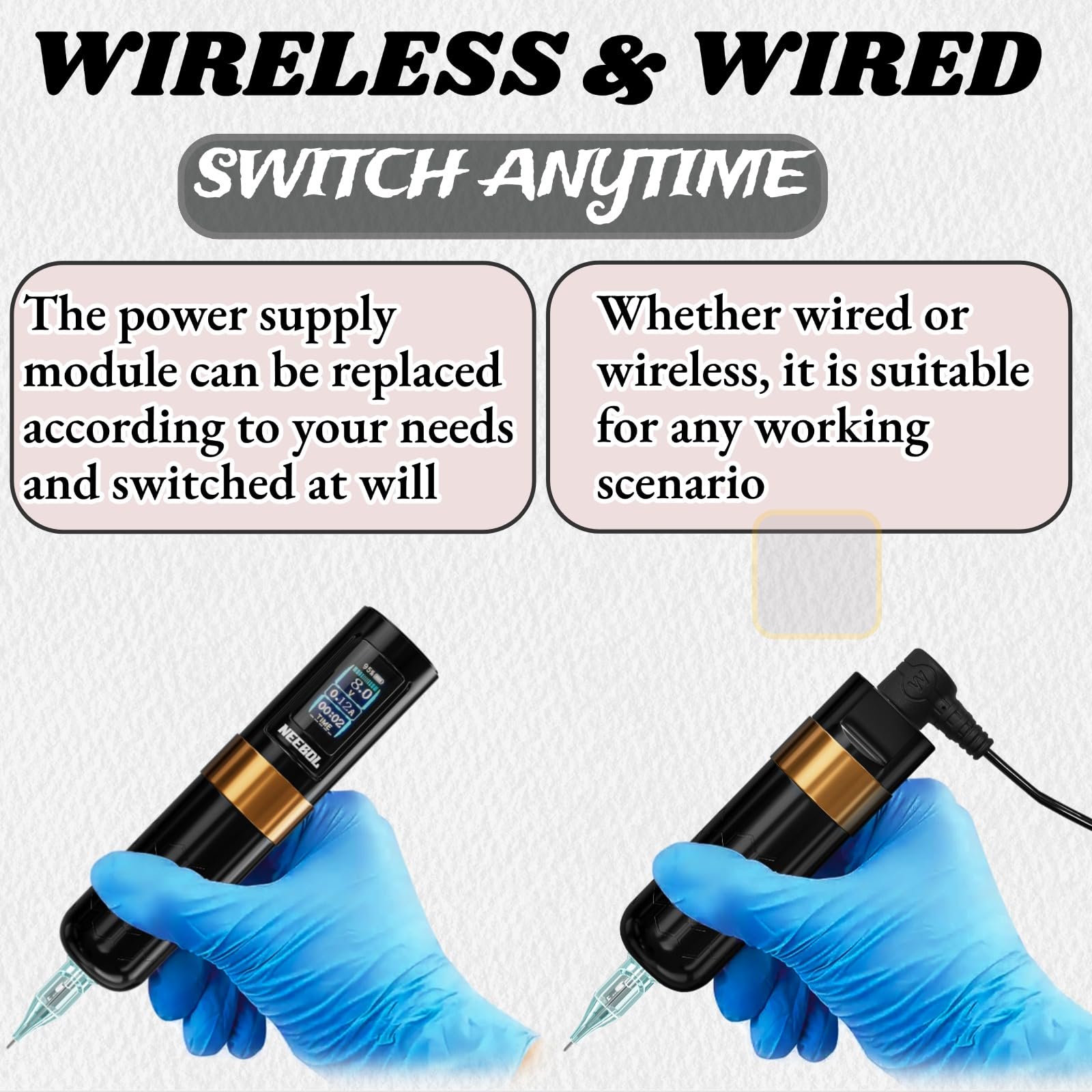 - Wired & Wireless Switch: The tattoo gun allows seamless switching between wired and wireless modes, catering to the artists’ preferences and working scenarios.