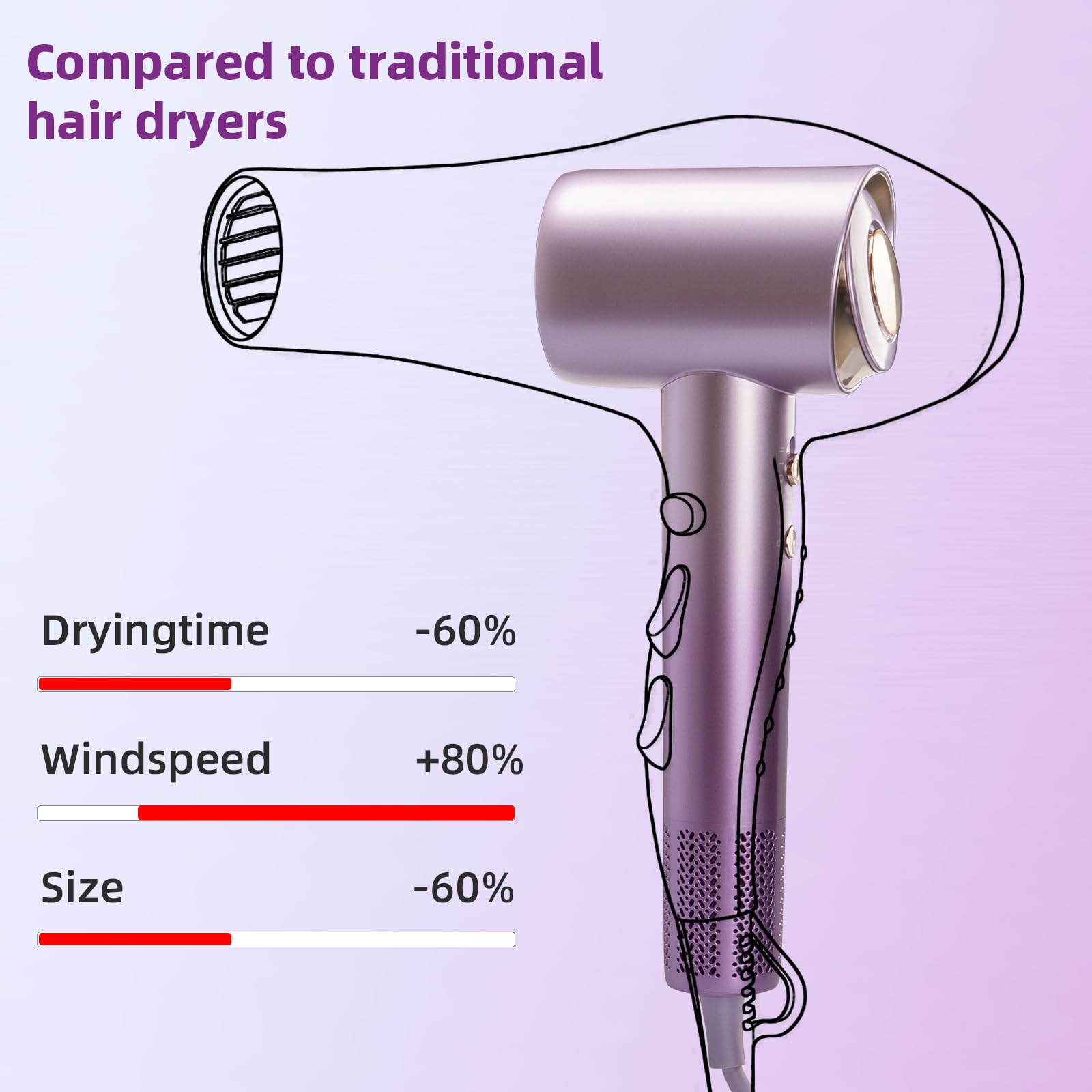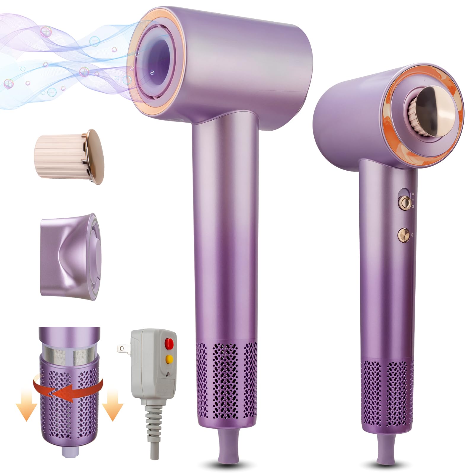 - High Speed hair dryer: hairdryer is adopt a -120,000 RPM high-speed brushless motor ,wind speed reaches 38m/s,which can quickly dry your hair in 3-5 minutes,5 times faster than conventional hair dryers,blow dryer built-in intelligent temperature control system,Real-time temperature monitoring and regulation,Prevents your hair from being damaged by too much heat.
