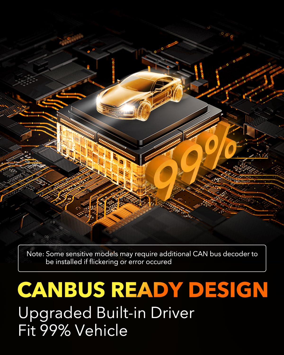- 【Fits 99% Vehicles】 Built-in intelligent driver ensures compatibility with 99% of vehicles without error codes or radio interference. Some sensitive models may require a CANBUS decoder.