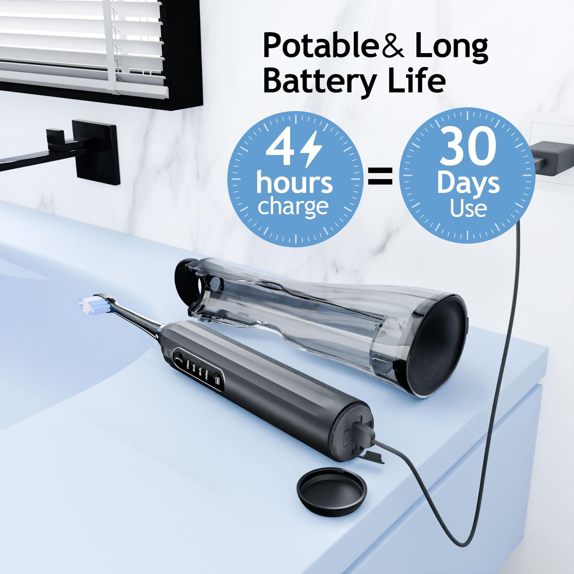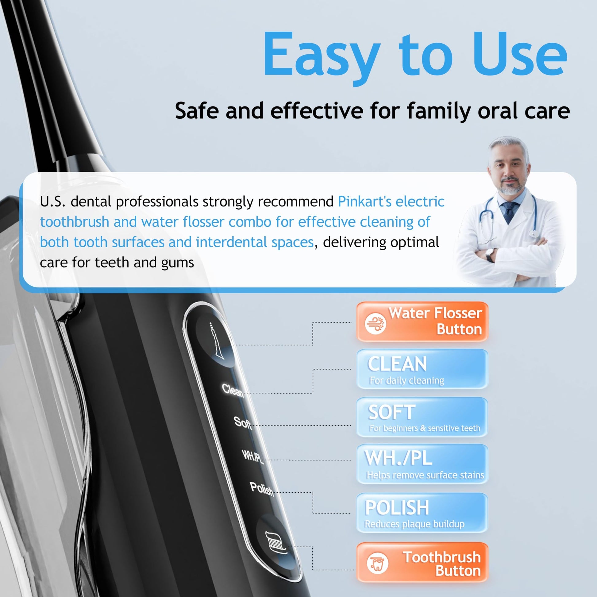 Pinkart Electric Toothbrush with Water Flosser Combo for Adults, 8 Brush Heads, 1 Flosser Tip, 1 Tongue Scraper, 1 Hose, 1 Water Tank – Ideal for Travel and Oral Health(Black and Gray)