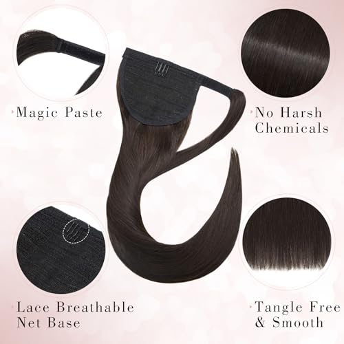 Ponytail Extensions Human Hair Long Straight Ponytail Hair Extensions with Magic Paste Wrap Around Clip in Ponytail Extensions Real Human Hair,18inch #2 Dark Brown,90g