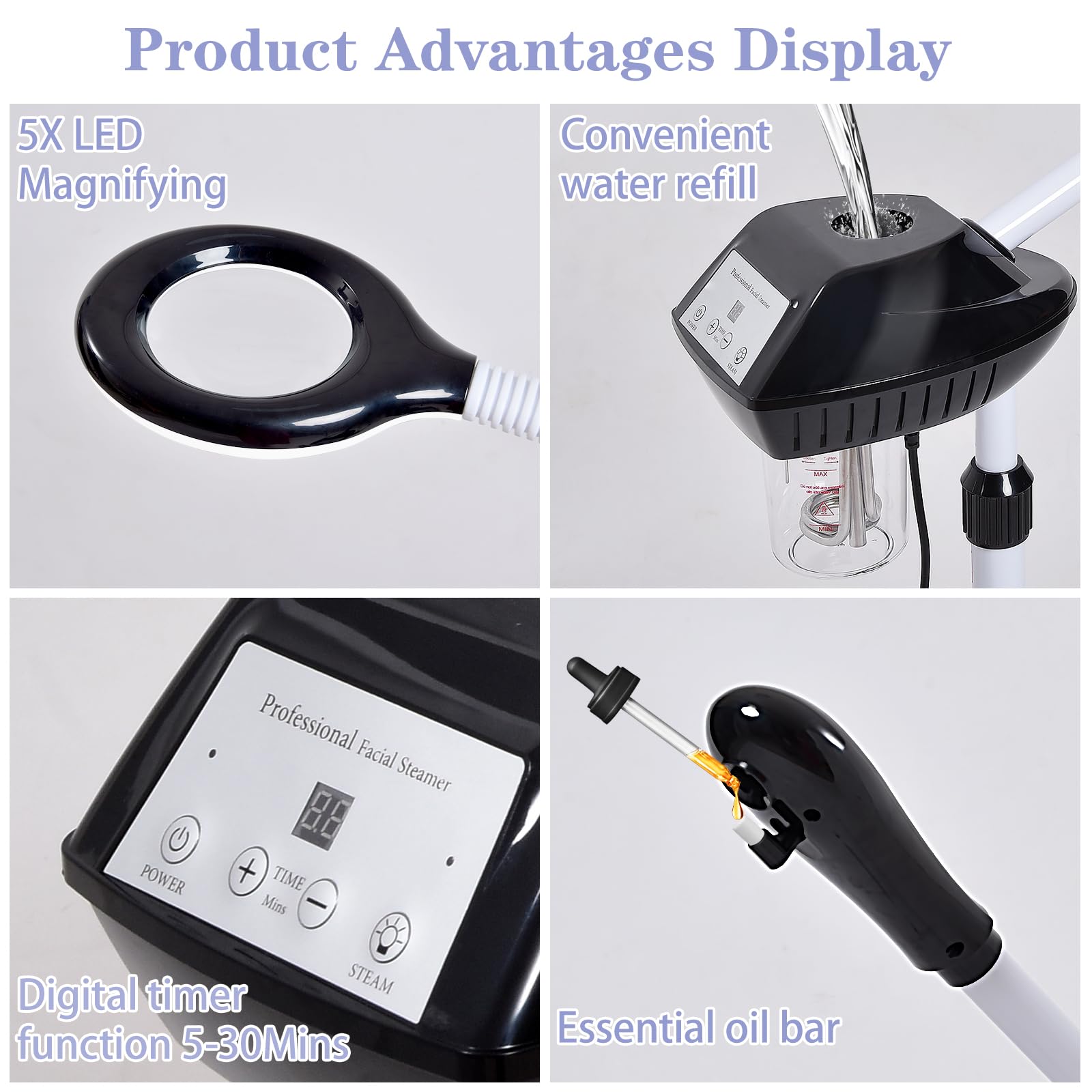 - 【5X Magnifying Lamp Facial Steamer】Face steamer with 5x magnifying lamp, led light and flexible adjustable arm, suitable for professional esthetician operation.