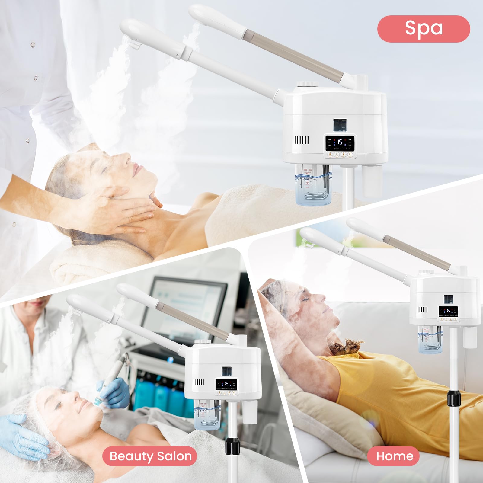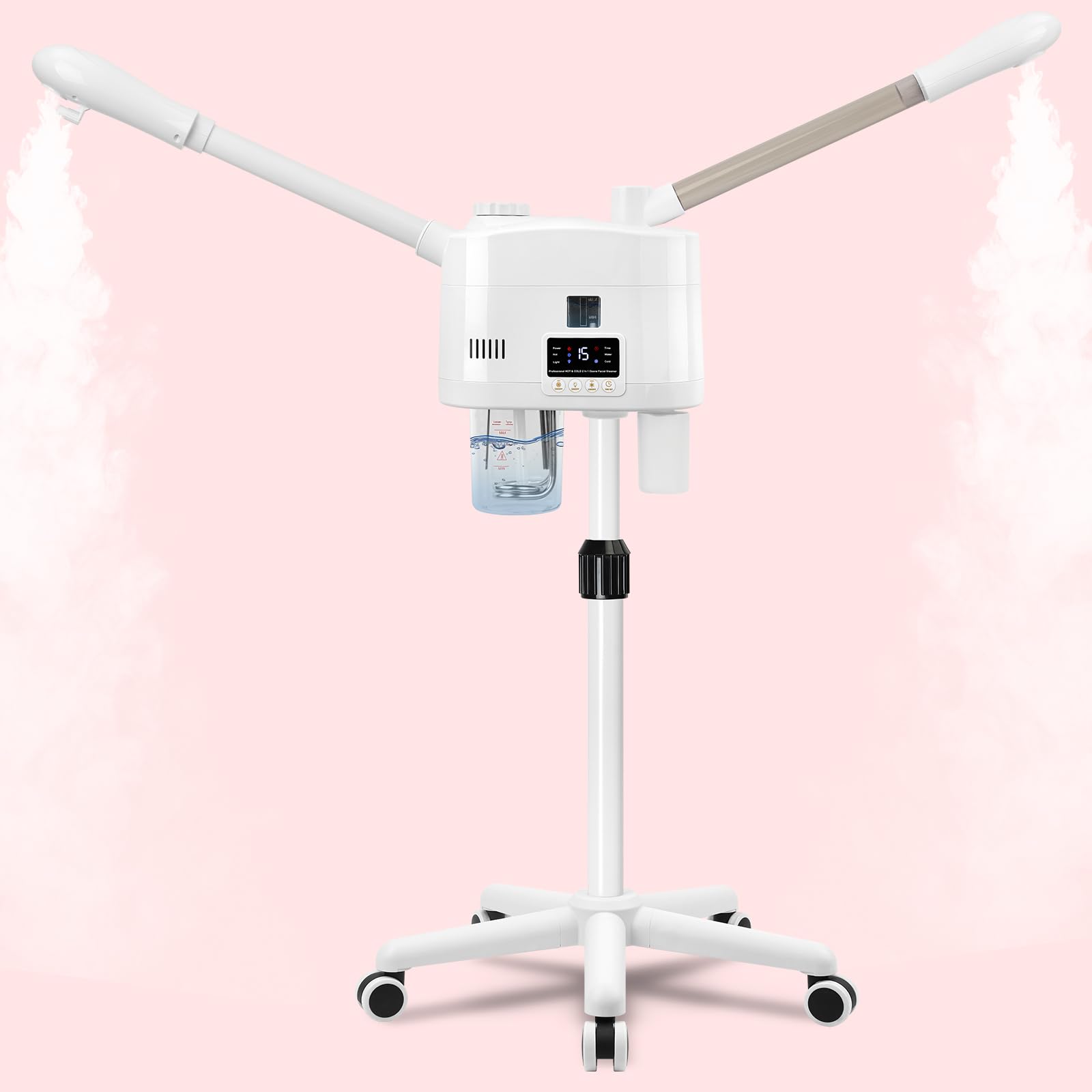 - 【Facial Steamer Professional】Our 2-in-1 facial steamer comes with upgraded misting cartridge, time setting function, removable 650ml water cup, waste water collector, a scent box, 36-51 inches of adjustable height, 360° rotating nozzle, and 360° rotating body.