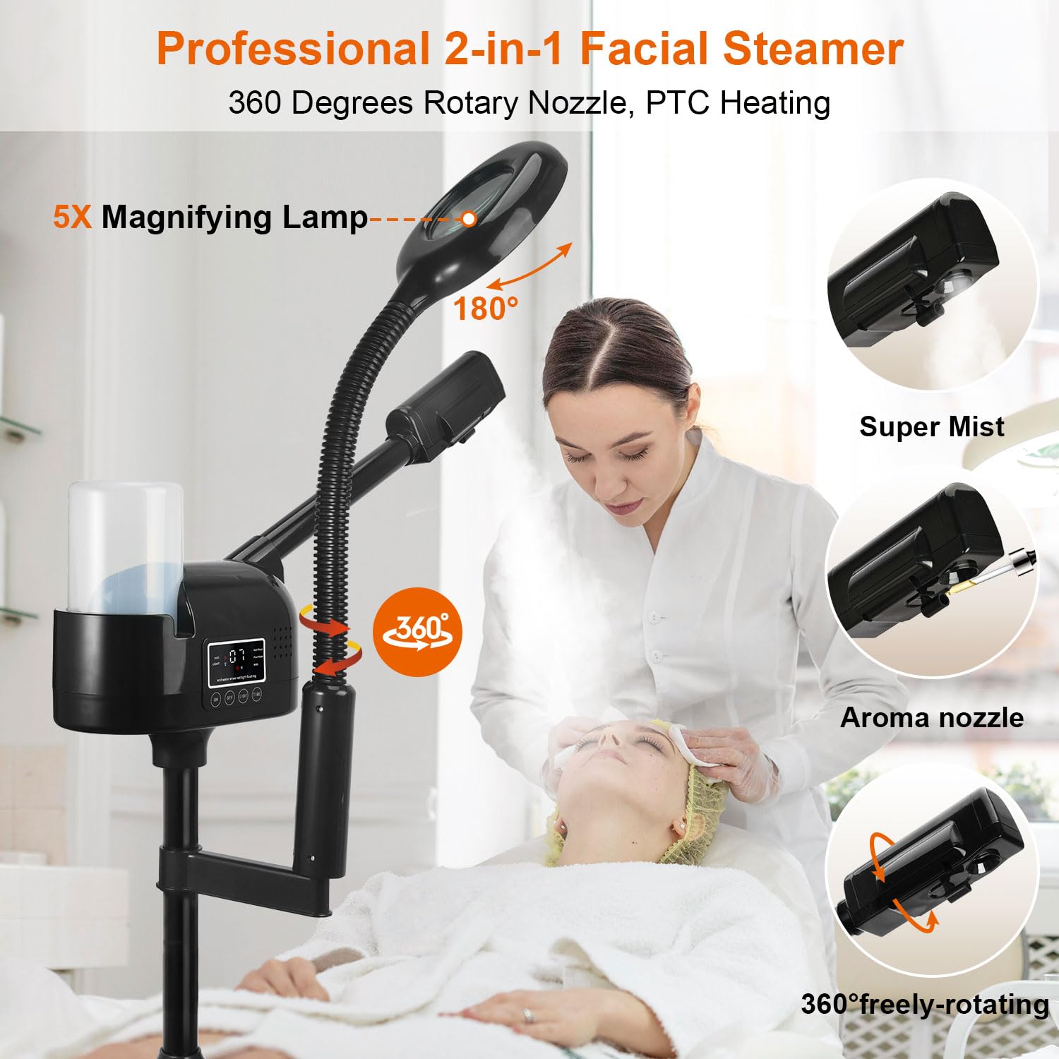 Professional Facial Steamer with 5X Magnifying Lamp, 2 in 1 Facial Steamer Upgrade PTC Heating, Esthetician Steamer Black Face Steamer for Salon Spa Beauty Skin Care (Black)