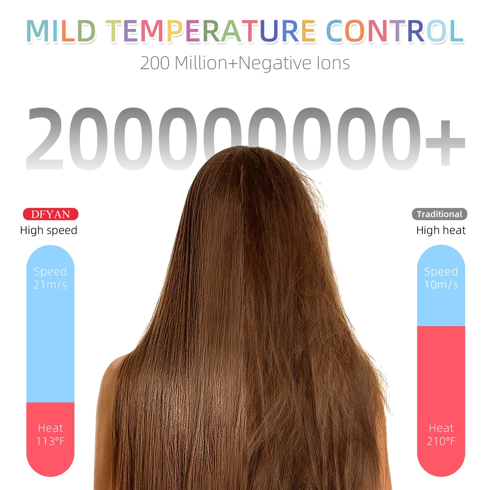- 【High-Speed Motor for Fast Drying】: It can dry quickly without extreme high temperatures.The DFYAN professional hair dryer adopts an ultra-high-speed brushless motor of 110,000 RPM and an open duct design, which can provide a strong air flow of 21m/s. Five times faster than traditional hair dryers, this hair dryer can quickly dry hair and reduce hair damage by increasing wind speed instead of relying on high temperature