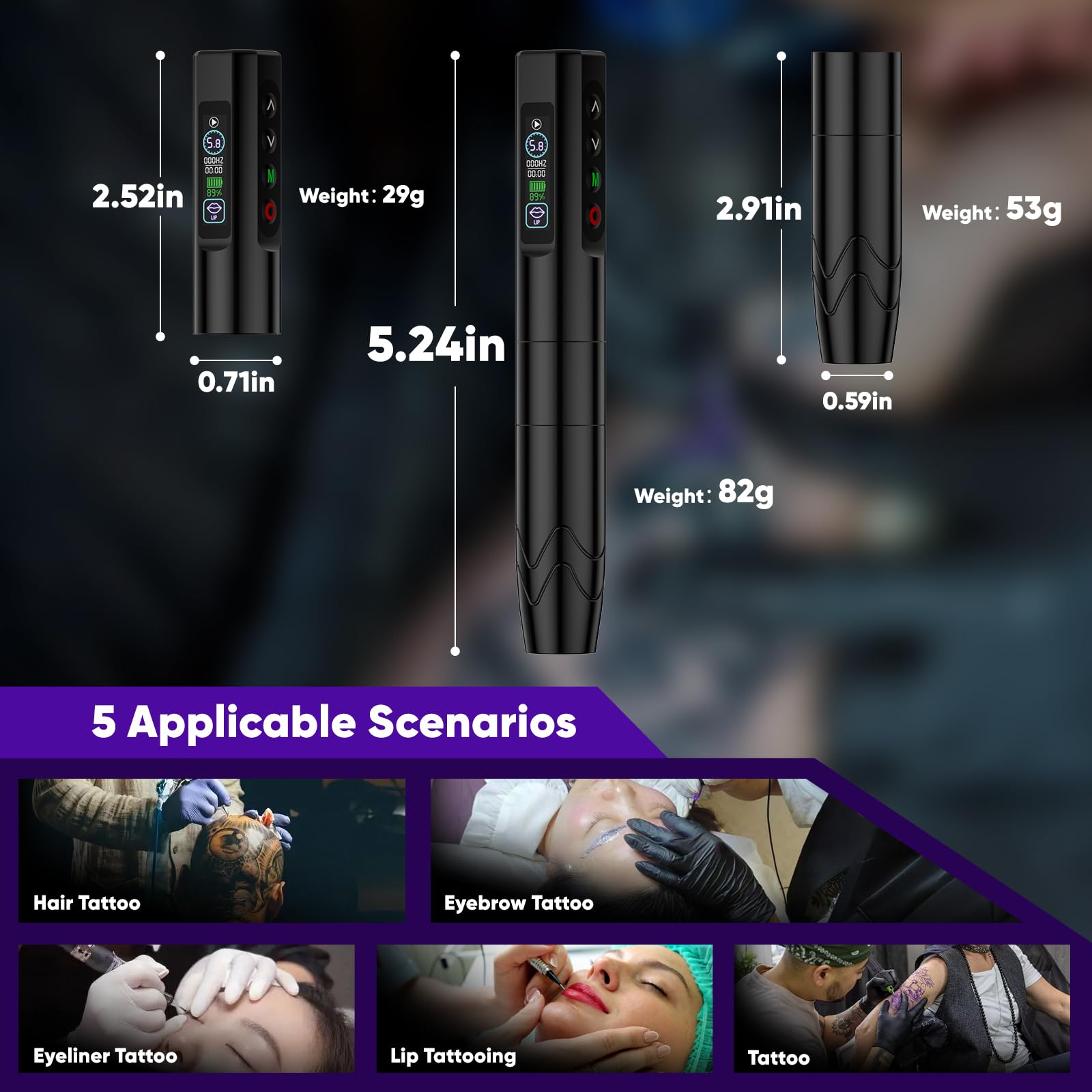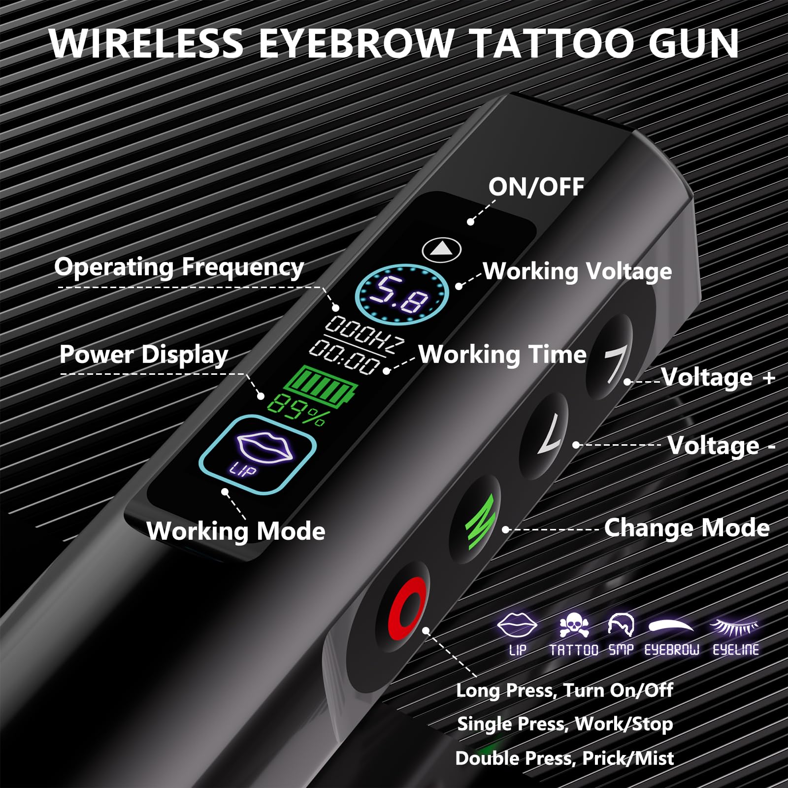 - ✨CORELESS MOTOR: Wireless tattoo gun is designed specifically for eyebrow tattooing, with stable continuous operation, low noise, and light weight, with an output voltage of 2V-9.9V and a speed of 6000-12000 revolutions per minute, more powerful, low skin loss, fast coloring, and does not generate heat after long-term operation; The battery capacity is 500mAh, with a built-in lithium battery that can support long-term tattoo work and stable output. 4V output voltage can work for 5 hours, and it only takes 2-3 hours to fully charge
