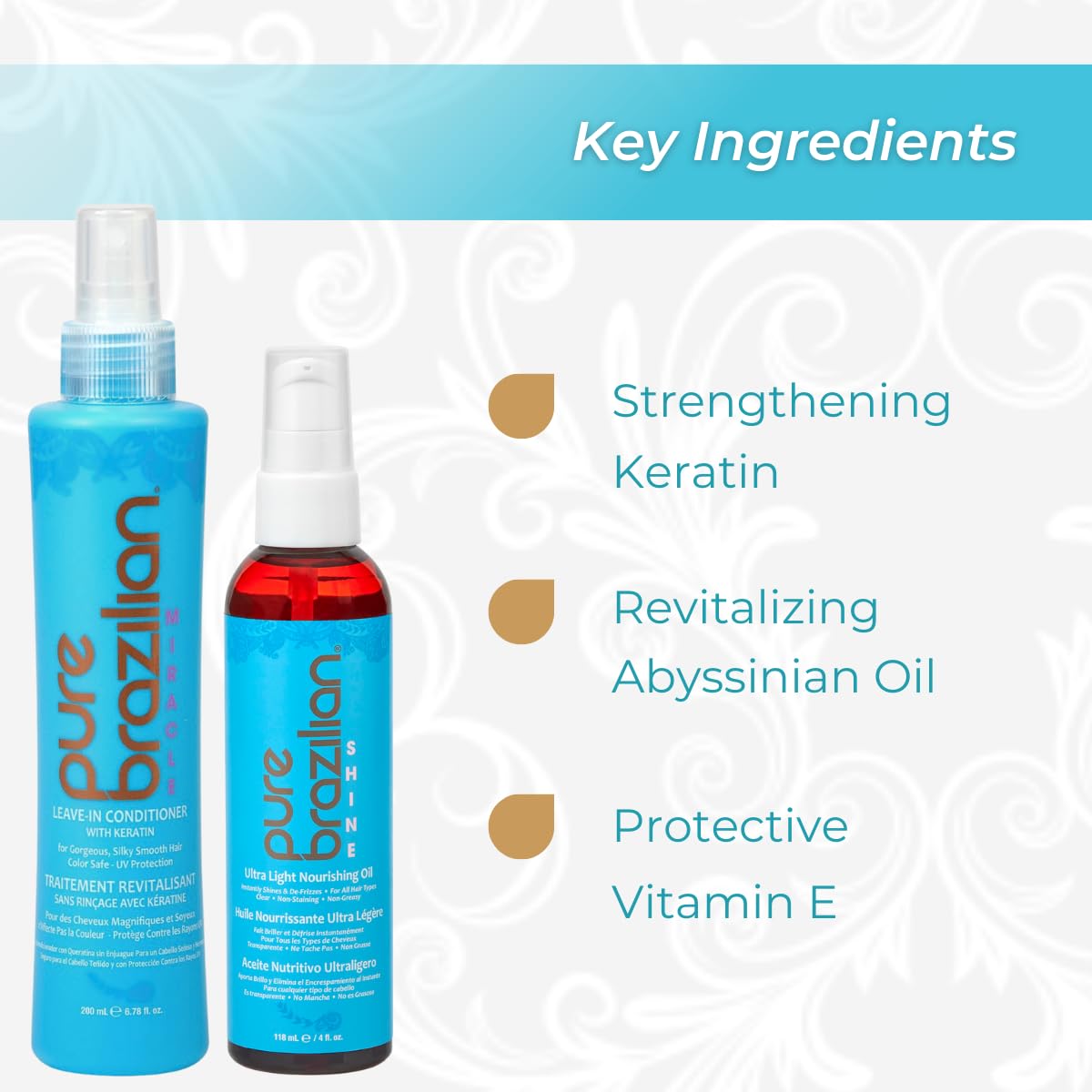 - PROTECTION AGAINST HEAT & UV DAMAGE: Style confidently with our PURE BRAZILIAN Leave-In Conditioner and Nourishing Oil, designed to protect your hair from heat styling tools and UV rays. Our products create a barrier that shields your hair while maintaining vibrant color and silky texture. Say goodbye to damage and hello to long-lasting, healthy locks.