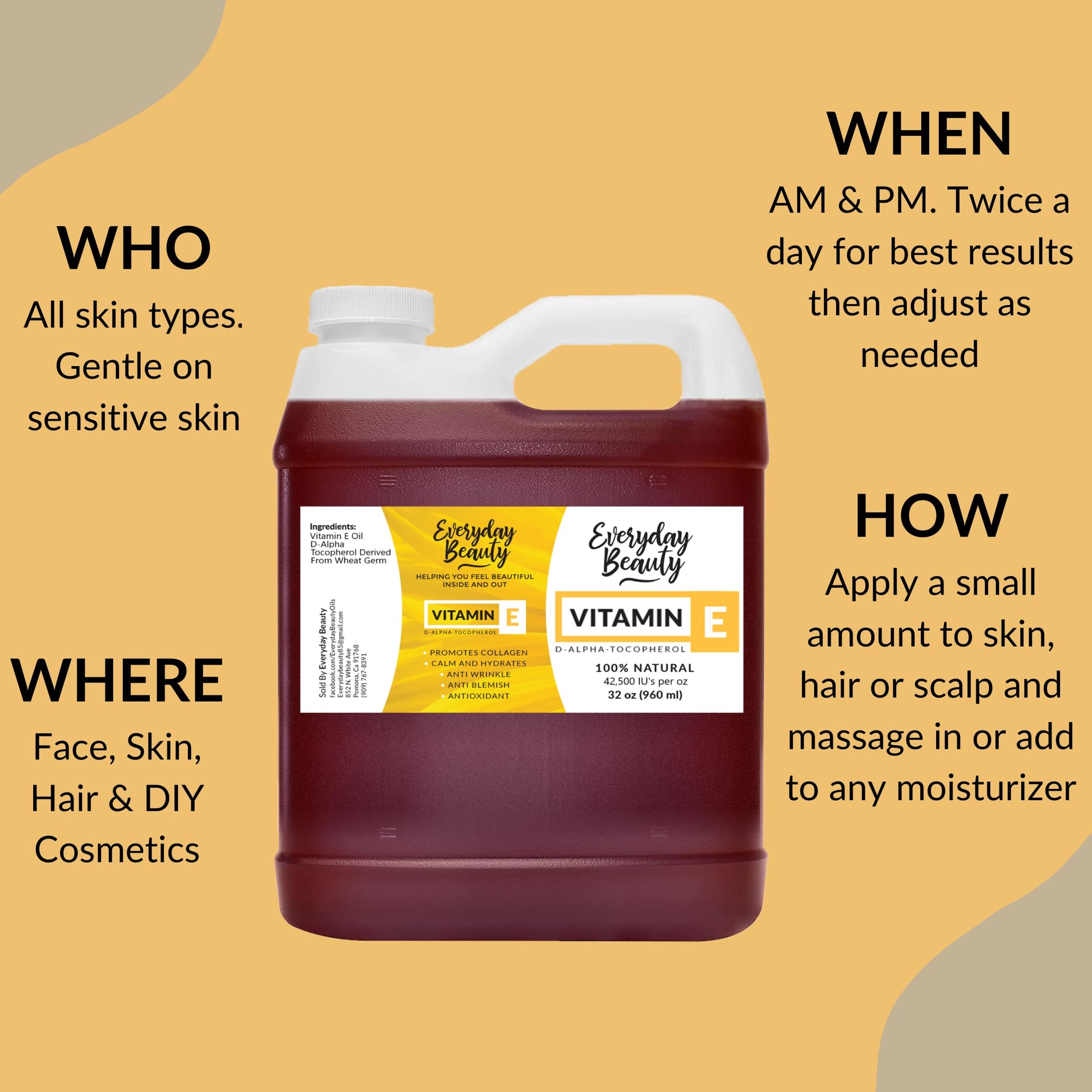 Details: Vitamin E D-Alpha Tocopherol 100% Pure and Natural 32oz Looking for the best beauty oil for face, skin, hair and nails? Peace of mind you can trust - Vitamin E oil is an all around great hydrating and deep penetrating carrier oil. Here are just some of the benefits of Vitamin E for skin and hair - Anti aging - Great for all skin types - Minimize appearance of scars - Helps reduce the appearance of wrinkles - Fades dark spots, sun spots and blemishes - Evens out skin tone - Helps promote production of collagen - Powerful Antioxidant - Calms and Hydrates skin - Help support cuticle and nail health - Help support hair growth - Prevent breakage and split ends - Boost elasticity and shine It's no wonder that Vitamin E oil is in so many beauty products for skin and hair. We ship all of our Vitamin E 32oz in HDPE jugs that are induction sealed for safety and freshness. Applying on your face - Wash face with cleanser, apply toner if desired and finish with massaging in a small amount of Vitamin E oil. Remember, a little goes a long way! Applying to skin - Add a small amount to area and massage into skin. Applying to hair - As an overnight hair mask add 1-2 tablespoons to hair, massage into scalp and hair and wash out in the morning. - Derived from Wheat Germ, with natural nutty aroma.