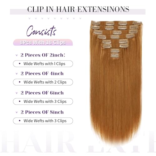 Remy Hair Extensions clip ins Hair Etensions for Women #30 Light Ginger Brown Double Weft Natural Hair Extensions Straight 8Pcs Soft and Thick 20inch 100g