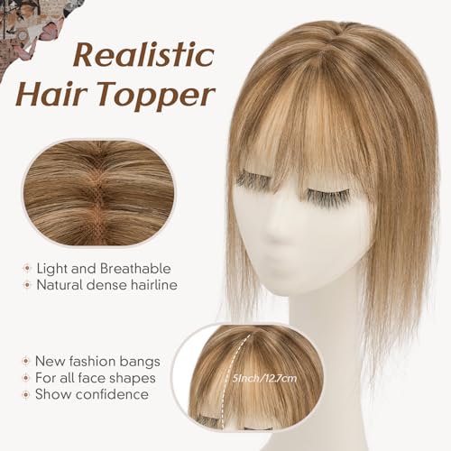 Rich Choices Hair Toppers for Women Real Human Hair 360¡Æ3D Clip in Bangs 100% Remy Human Toppers with Bang for Thinning 150% Density Lace Base 08 Inch #4P27 Medium Brown Highlight Dark Blonde