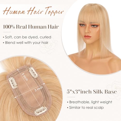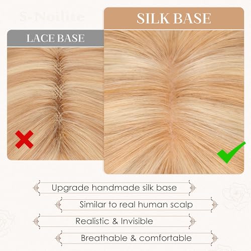 S-noilite Human Hair Toppers for Women with Bangs 100% Real Human Hairpiece 5"x3" Clip in Silk Base Topper Piece Cover Thinning Fine Hair 12 inch Camel Brown Highlighted Blonde