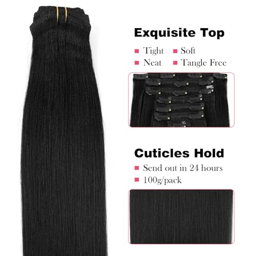 Sassina 20 Inch Yaki Straight Clip in Hair Extensions Virgin Human Hair Jet Black Double Wefts for African American Black Women 7 Pieces 120g with 17 Clips