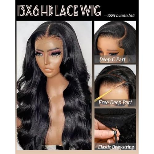 - ¡¼Body Wave HD Lace Front Wig Quality¡½HD Transparent Lace Front Wigs Human Hair Pre Plucked, True to Length, Shedding Free, Tangles Free, No Smell, Soft; Half Wig Human Hair 10A Grade Human Hair, And An Elastic Drawstring Band At The End To Make It Easier To Put On, Making It Very Beginner-Friendly